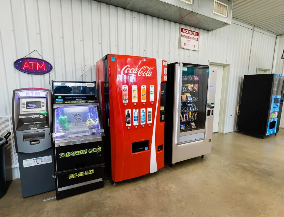 Amenities include ample parking, TV, folding tables, seating, snack/drink vending machines, laundry product vending, change machine, ATM, and skill games.